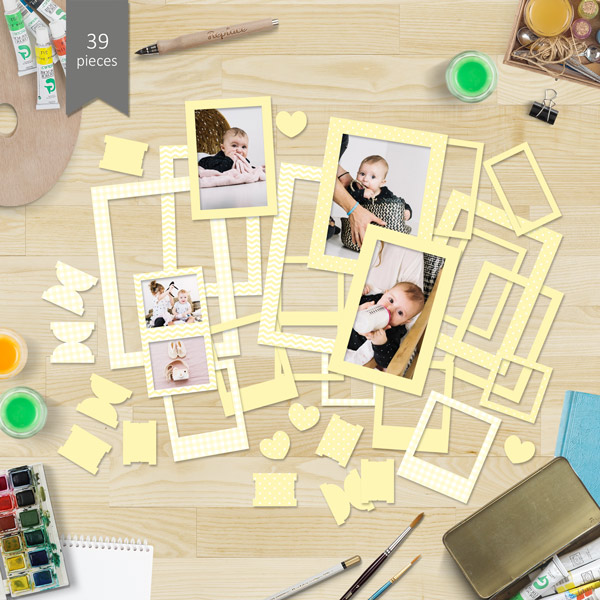 39 штук. Набор декоративных двусторонних бумажных высечек в виде фоторамок и элементов для украшений фотоальбомов, блокнотов и других творческих работ.¶¶Рамки разработаны как для стандартных размеров фотографий и для инста-фото 10см x 15см, 9см x 13см, так и других нестандартных проектов. Одна сторона рамок однотонная, а на обратной стороне изображены универсальные дизайны узоров: горошек, шеврон и клетка.