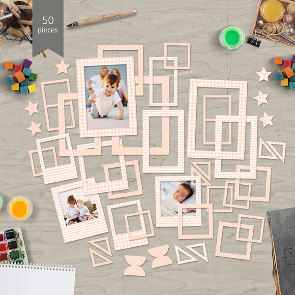 39 штук. Набор декоративных двусторонних бумажных высечек в виде фоторамок и элементов для украшений фотоальбомов, блокнотов и других творческих работ.¶¶Рамки разработаны как для стандартных размеров фотографий и для инста-фото 10см x 15см, 9см x 13см, так и других нестандартных проектов. Одна сторона рамок однотонная, а на обратной стороне изображены универсальные дизайны узоров: горошек, шеврон и клетка.