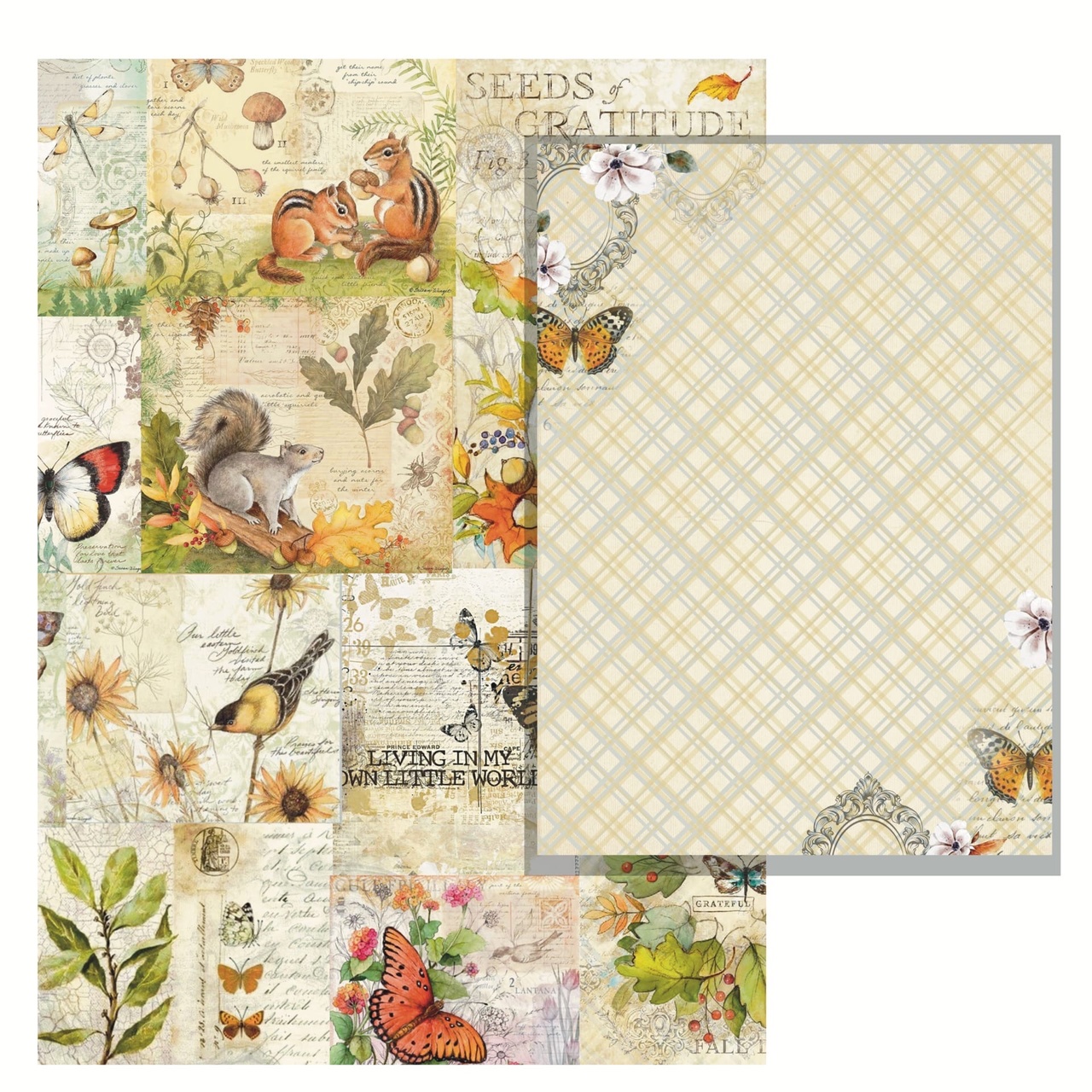 Набор двусторонней бумаги 20х27.5 см (чуть меньше А4), 8 листов (7листов двусторонних + односторонний лист с элементами для вырезания) + бонус элементы для вырезания на обороте обложки, плотность 250 г/м2.