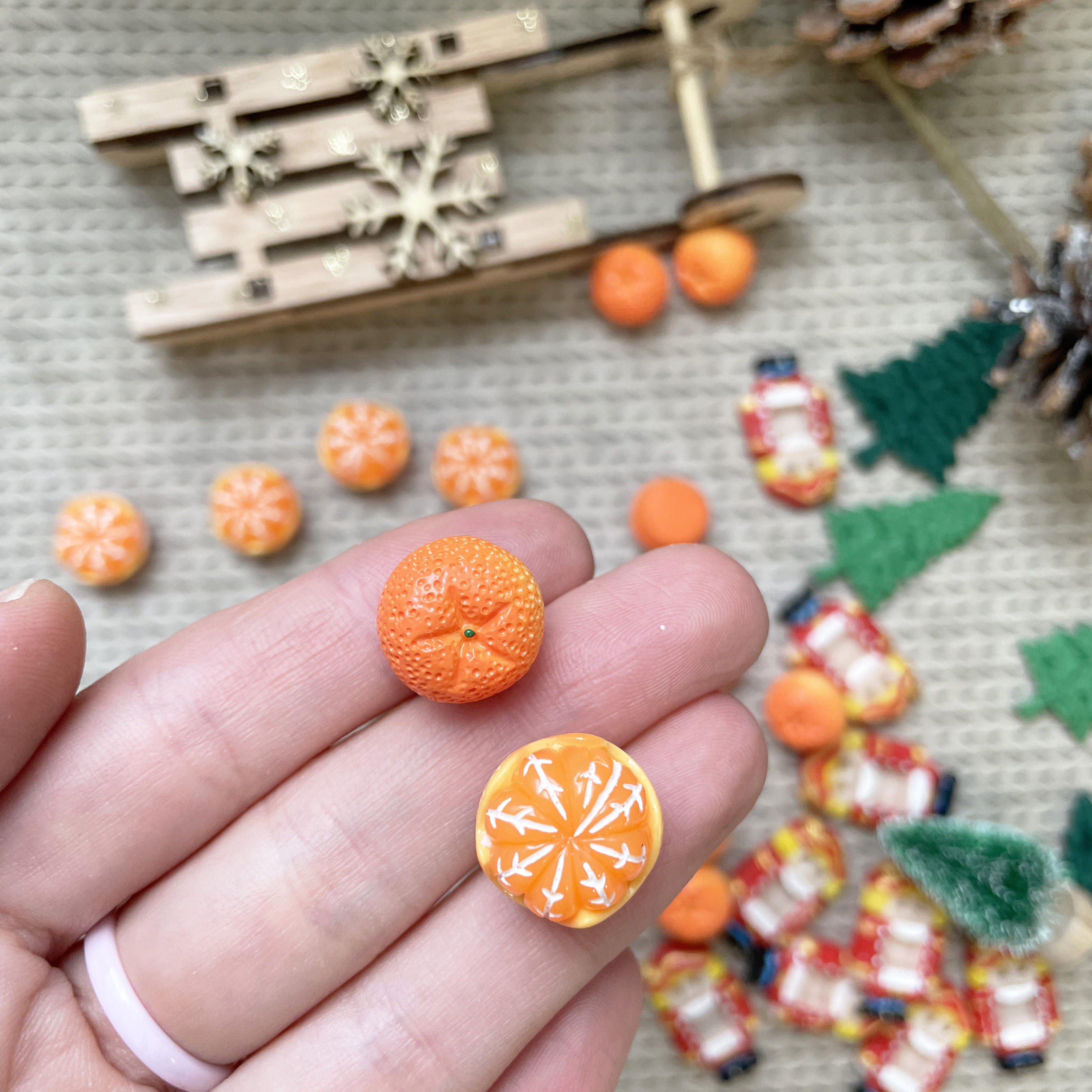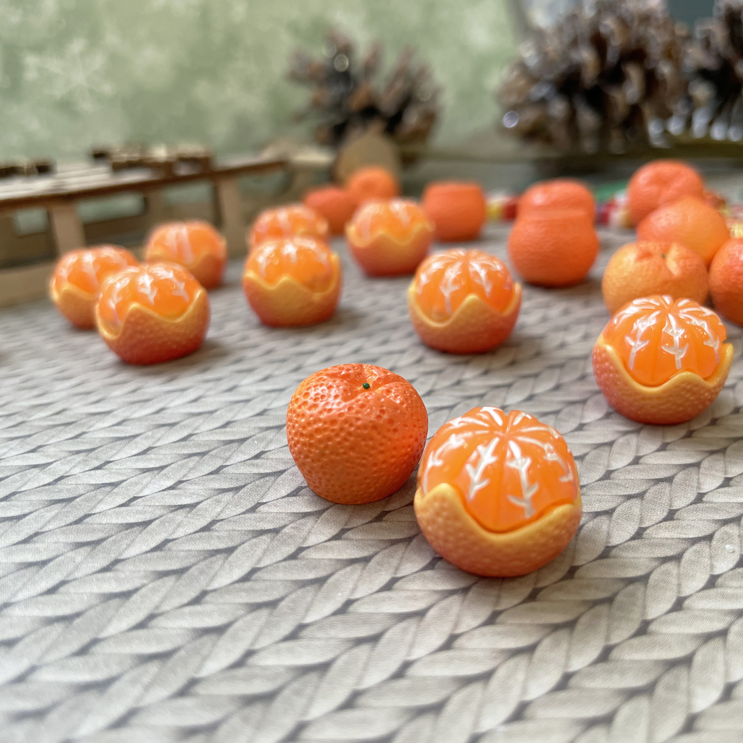 В наборе искусственная хвойная веточка (5-6 см в длину и 1,8-2 см в диаметре), и 2-е фигурки мандарина (размеры 1,7х1,7х,1,5 см и 1,5 х 1,5 х1,5 см)