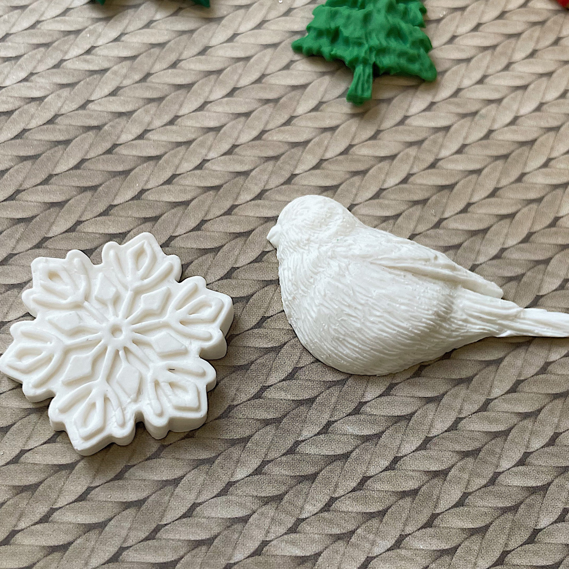 Размеры: снежинка 3 х 3 х 0,3 см, снегирь 4,7 х 2,3 х 0,8 см. Выполнены вручную из полимерной глины