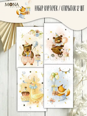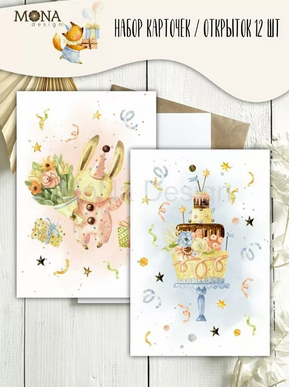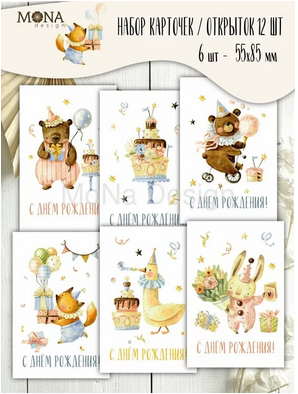 В наборе 12 открыток. 6 шт- 55*85 мм и 6 шт - 100*150мм. Плотность 300 гр/м2.