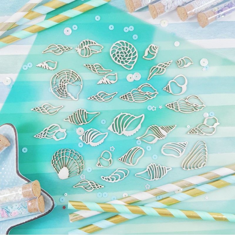 В наборе 30 элементов. Размер наибольшей раковины 2,6 х 2,8 см, наименьшей ракушки 1,5 х 0,8 см. Чипборд изготовлен из пивного картона толщиной 1,15 мм.