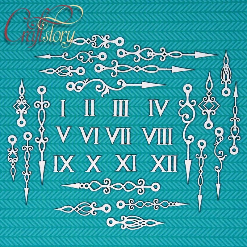 В наборе 20 стрелок и 12 римских цифр. Высота цифр: 12 мм, длина наибольшей стрелки: 7,2 см, наименьшей: 3,4 см.