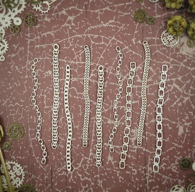 Размер цепей 14,5см. В набор входит все, что представлено на фотографии. Чипборд изготовлен из пивного картона толщиной 1,15 мм.