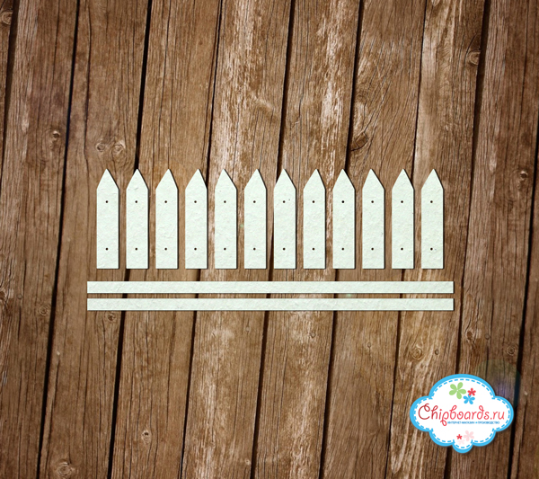 Высота заборчика ~ 3 см.Нанесены имитации гвоздиков. Чипборд выполнен из материала толщиной 0.9 - 1.15 мм.