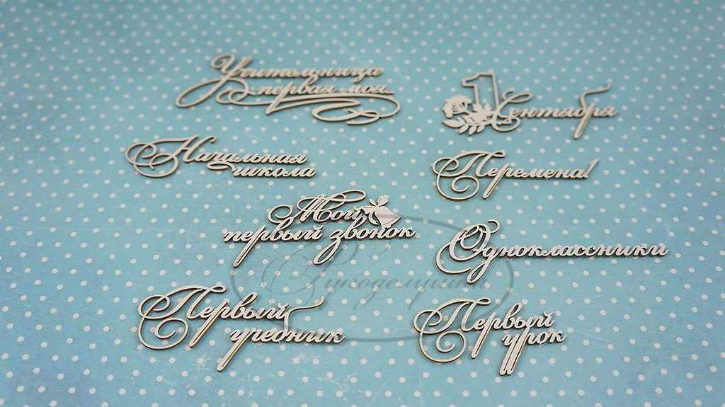 длина надписей от 4,5 см ("первый урок") до 8,5 см ("учительница первая моя"). Используется в качестве украшения для скрапбукинга . Применяется в любых работах. Возможно окрашивание акрилом, акварелью, спреями или любыми другими красящими составами.