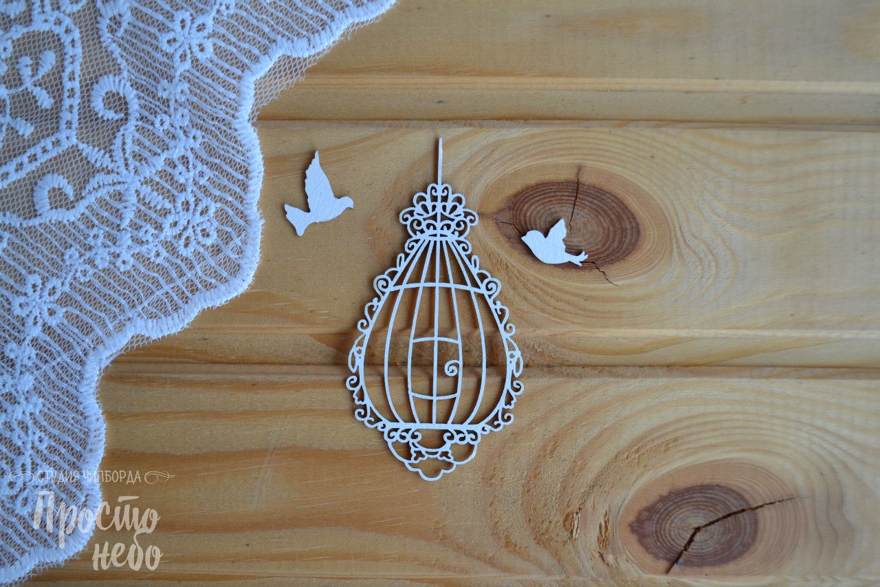 размер 4,6х9, в наборе 3 элемента (клетка и 2 птички). Выполнен из картона кремового цвета толщиной около 1,55мм.