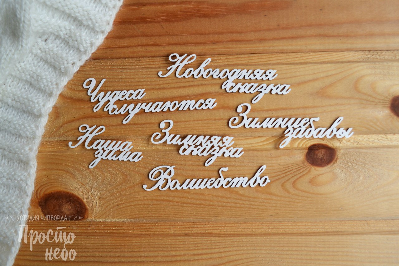 размер: Чудеса случаются 8,2х2,9 - Наша зима 4,8х2,7, набор из 6 элементов. Выполнен из картона кремового цвета толщиной около 1,55мм. Можно использовать как самостоятельный декор, а также раскрашивать любыми красящими составами: спреями, красками или чернильными подушечками.