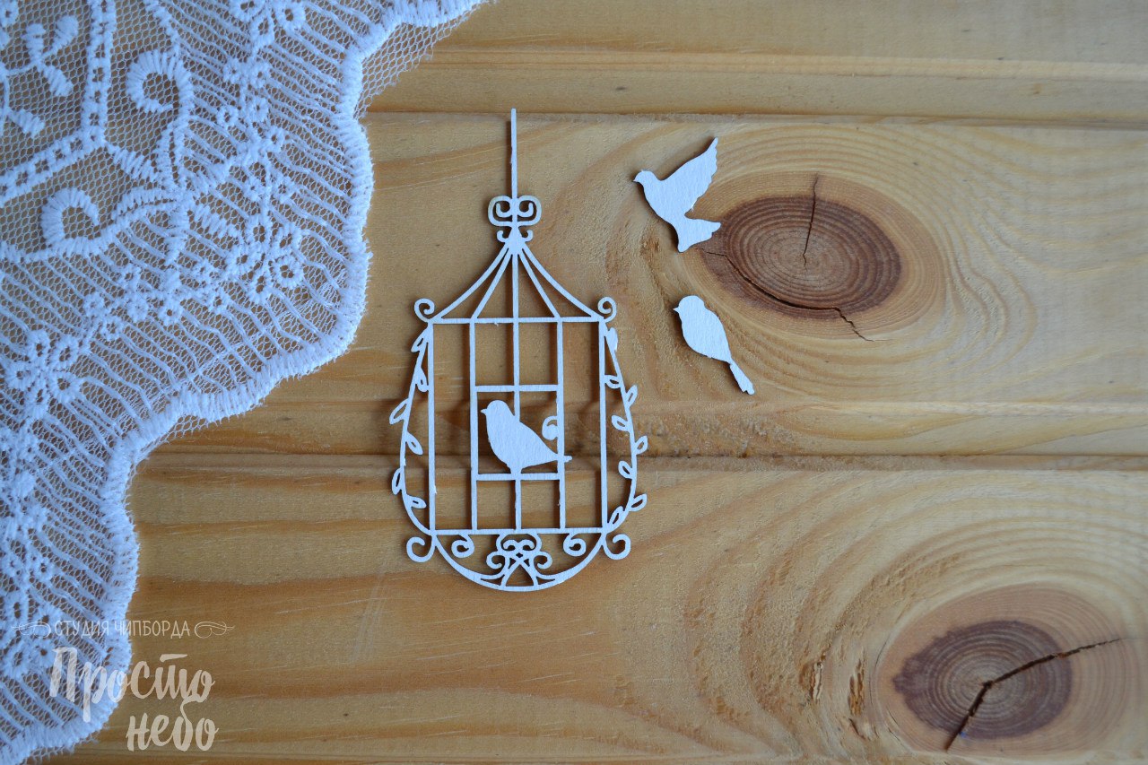размер 4,8х9, в наборе 3 элемента (клетка и 2 птички). Выполнен из картона кремового цвета толщиной около 1,55мм.
