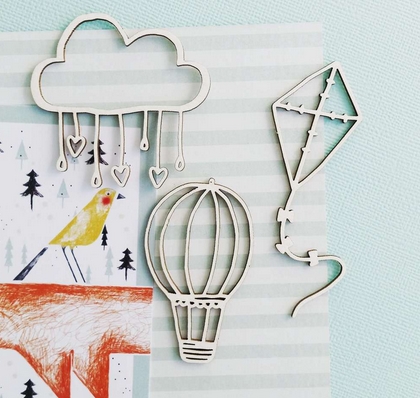 Размеры по высоте: воздушный шар около 6 см; облачко около 5,5 см; воздушный змей около 8 см. Картонный чипборд толщиной 1,5мм - незаменимое украшение для страничек,открыток и фотоальбомов! Придает объем работе и является интересным акцентом. При желании можно покрасить, отштамповать, нанести кракелюр и эмаль, сделать эмбоссинг. Приклеивается с помощью клея или горячего пистолета.