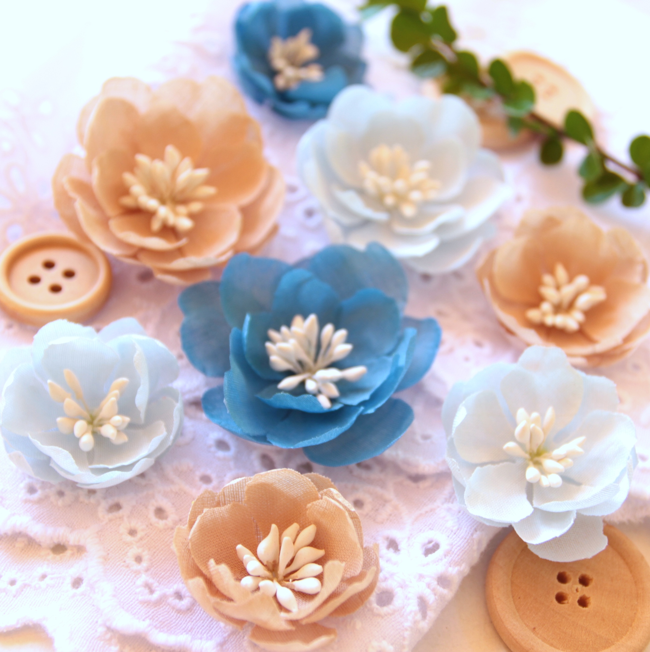 В наборе 8 цветов 3,5 см и 4,5 см. Цветы выполнены из ткани. Очень нежные и воздушные.
