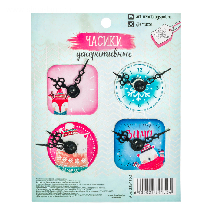 Декоративные часики - интересное украшение для скрап-работы или открытки. Стрелки свободно двигаются.Набор состоит из 4 объёмных элементов. К картонной основе часики крепятся с помощью брадса. Брадс входит в набор.
