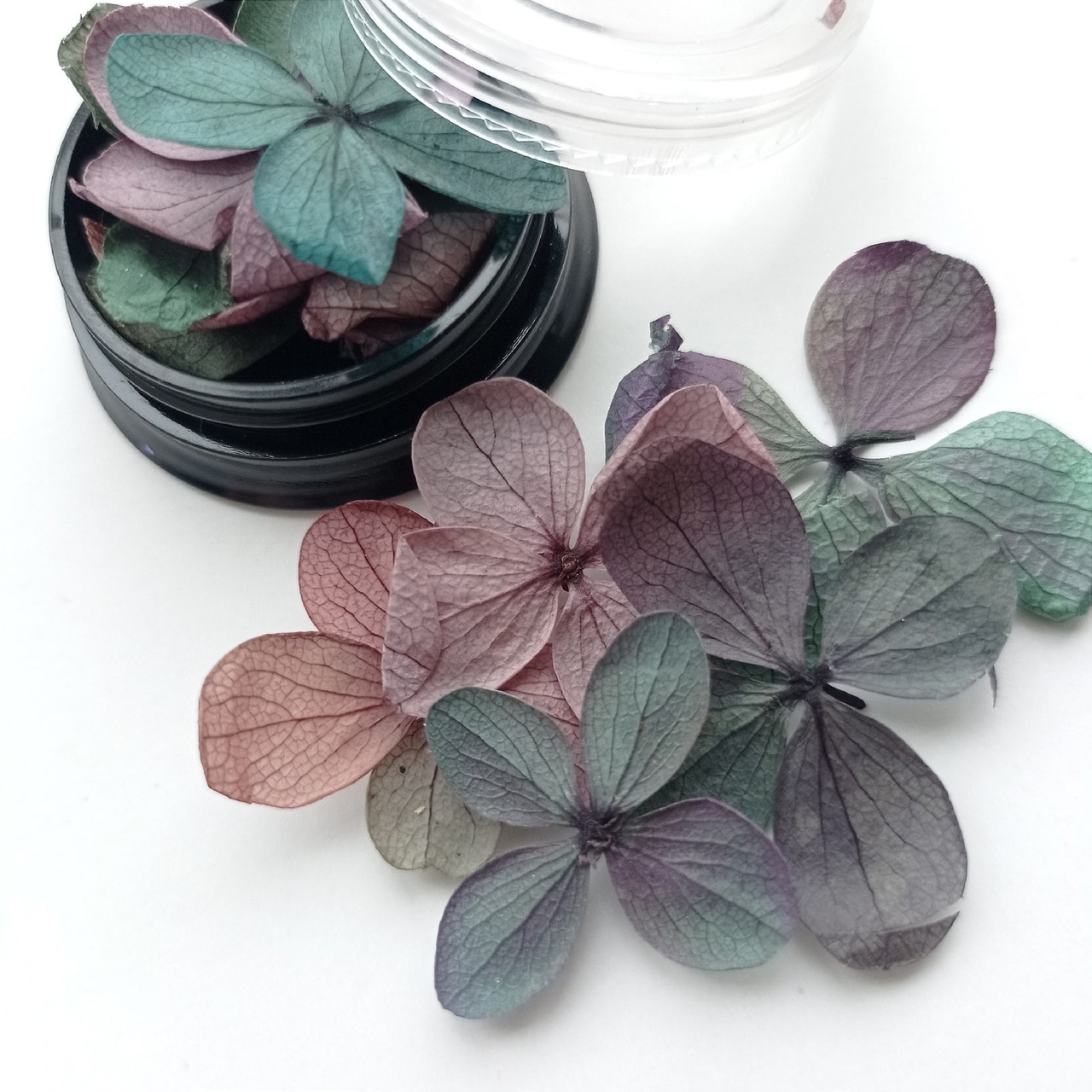 6-8 цветов разного размера. Подхдит для заливки в смолу, закатывания в текстурную пасту и как самостоятеьный декор. Ни в одной баночке нет повторяющихся по форме цветов, так как цветы натуральные.