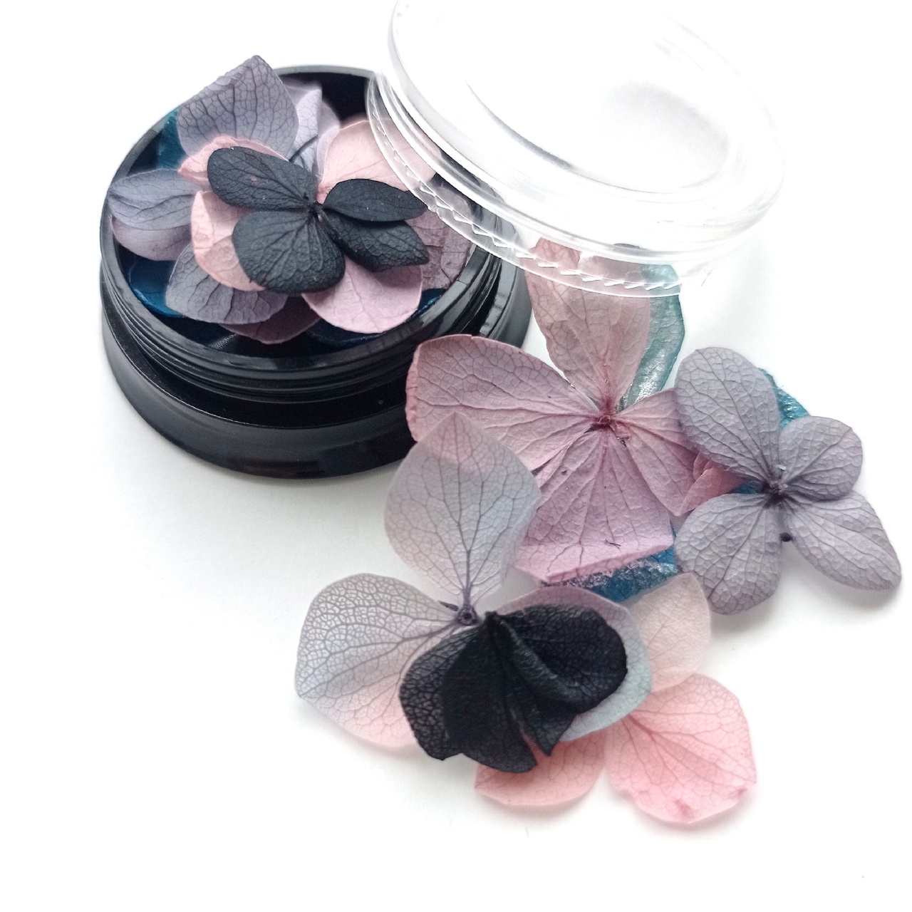 6-8 цветов разного размера. Подхдит для заливки в смолу, закатывания в текстурную пасту и как самостоятеьный декор. Ни в одной баночке нет повторяющихся по форме цветов, так как цветы натуральные.