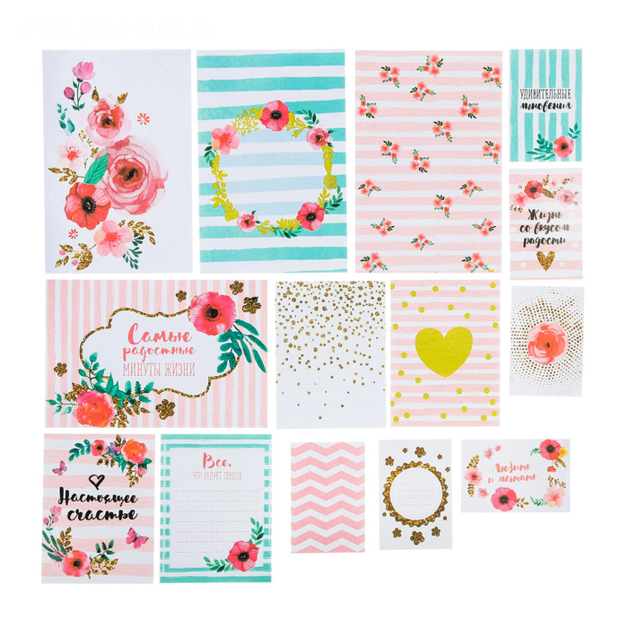 В наборе 14 карточек (10 х 15 см 4 штуки, 7,5 х 10 см 4 штуки и 5 х 7,5 см 6 штук)