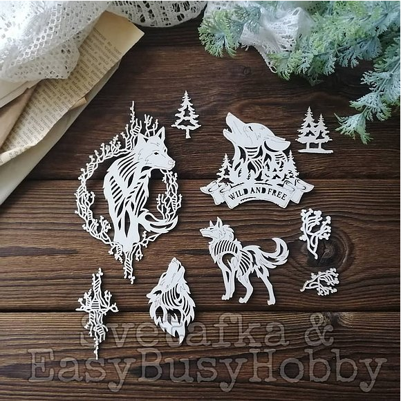 Размер плашки 15 на 19 см. Волк в пещере - 13см. Соцветие -2,5см. В наборе 9 элементов. Выполнен из картона кремового цвета толщиной 1,5мм.