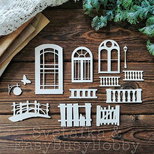 Размер плашки 15 на 19 см. В наборе 13 элементов. Выполнен из картона кремового цвета толщиной 1,5мм.