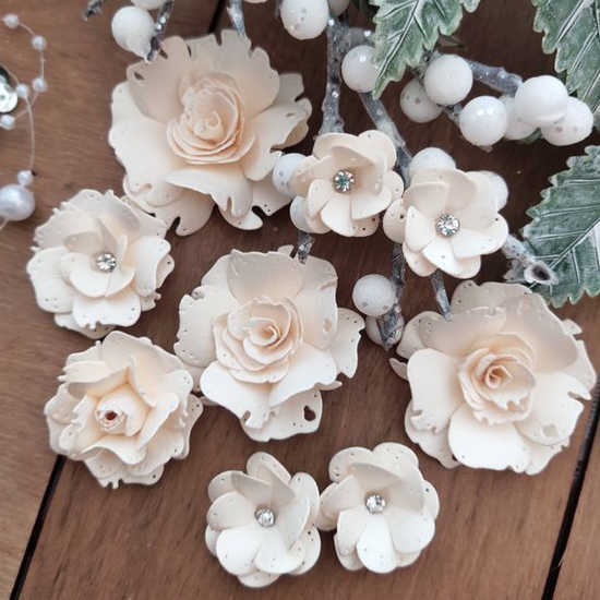Выполнены из акварельной бумаги. Диаметр цветов в наборе: 1,5 см, 2см, 2,5 см, 3 см.