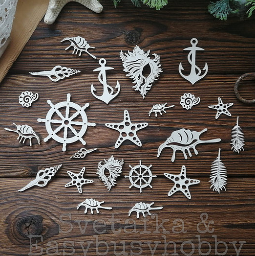 Размер плашки 19*15 см. Размер максимальный - ракушка - 6,5 см. Большой штурвал- 5,5 см. Размер самой маленькой ракушки - 2 см. Выполнен из картона кремового цвета толщиной 1,5мм.