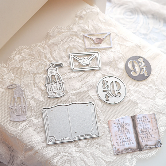 В наборе 4 ножа. Размер вырубки Книга в готовом виде 5х3,5 см, Письмо - 3х2 см, Фонарь - 2х3,7 см и Знак 3/4 - 3х3 см.