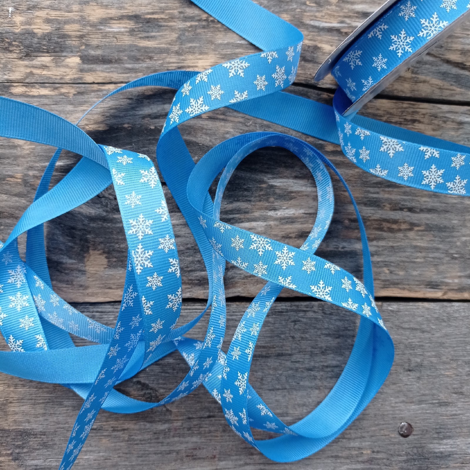 Лента репсовая со снежинками 15 мм Голубой