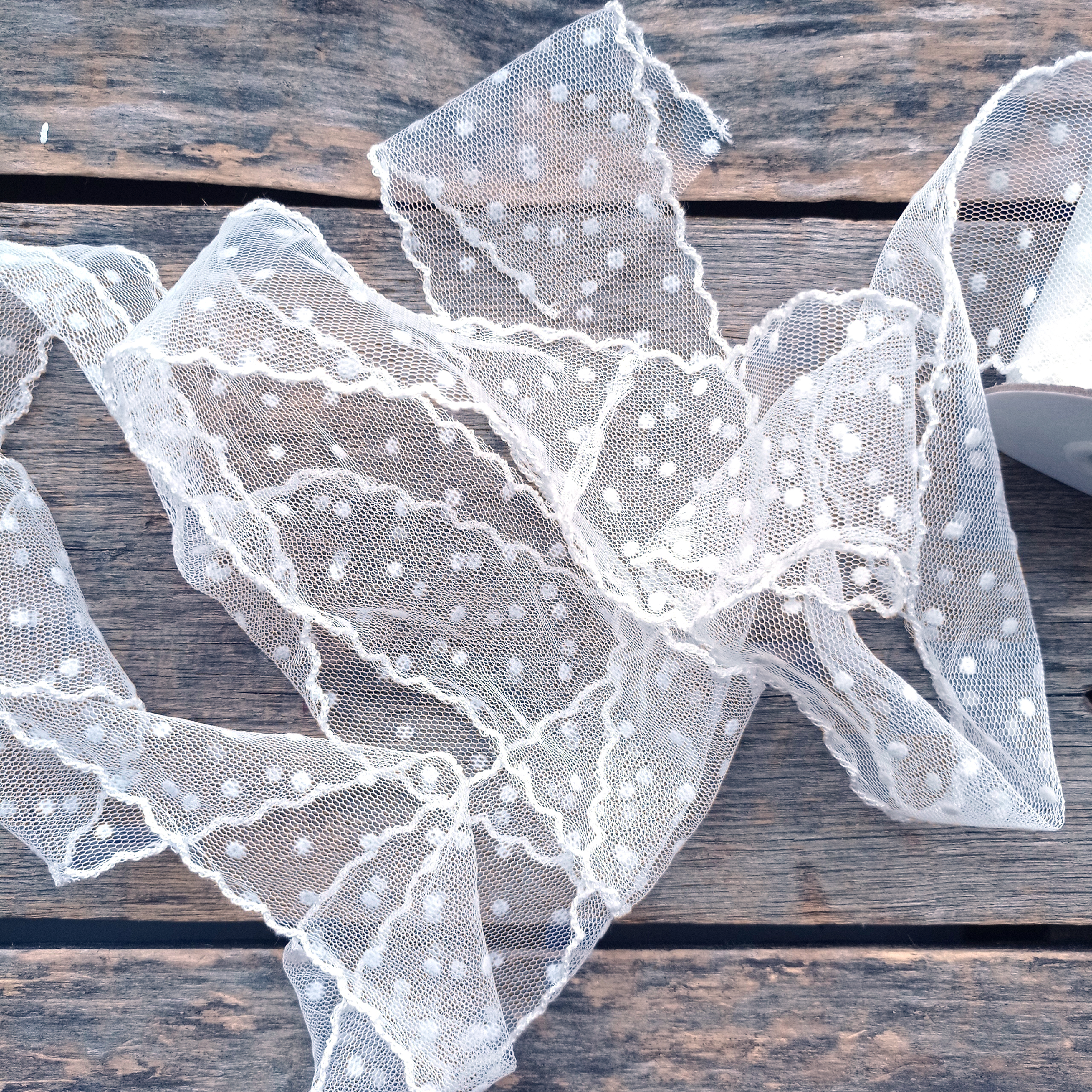 Лента-сетка с обработанным волнистым краем и рисунком "горошек". Ширина 5,5 см. Цена за 1 метр.
