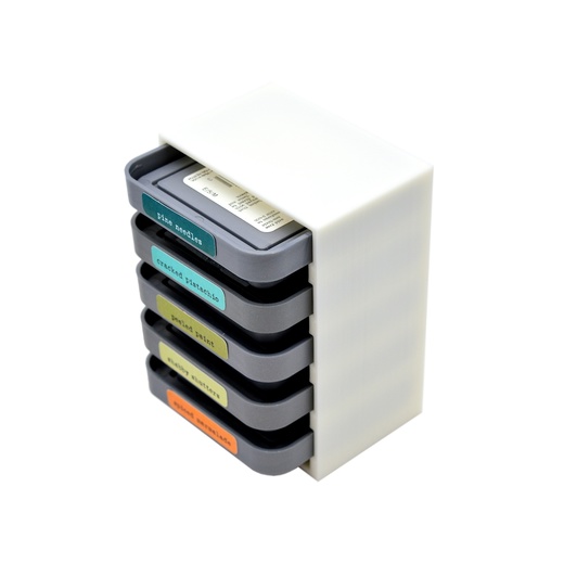 Модуль стеллажа для полноразмерных штемпельных подушечек Distress выполнен из белого экологичного биоразлагаемого пластика, вмещает в себя пять штемпельных подушечек. Из модулей можно составлять различные комбинации или размещать отдельно. Размеры одного модуля: глубина 54, высота 108, длинна 80. Подушечки в комплект не входят.