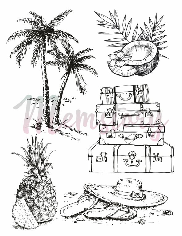 Штамп фотополимерный, бирюзового цвета. Размеры штампов: пальмы 5 х 7,2 см; кокос 4 х 3,8 см; чемоданы 4,8 х 4,9 см; ананас 2,6 х 5,3 см; сланцы и шляпка 6,2 х 2,6 см.