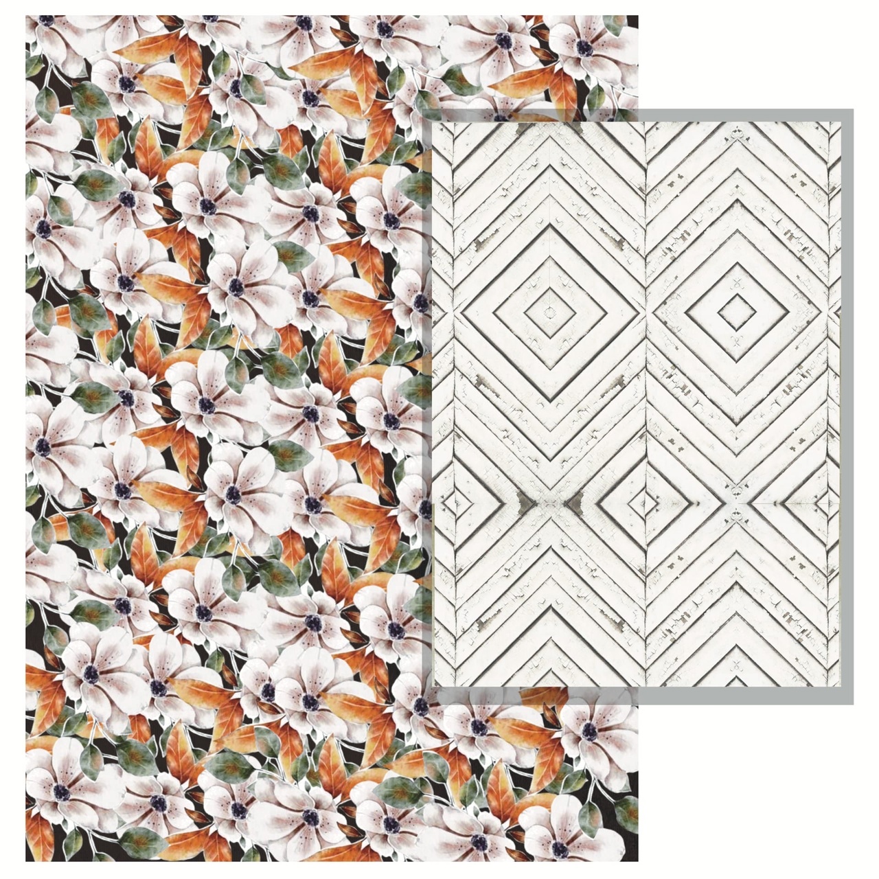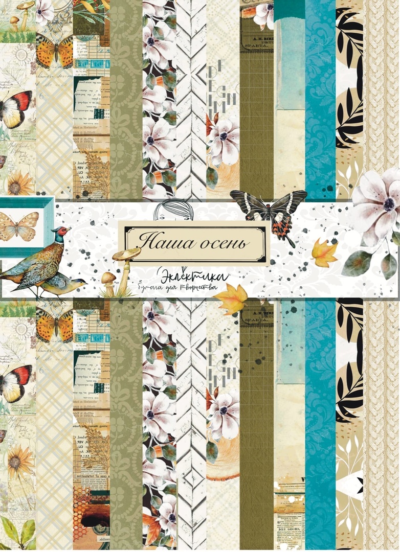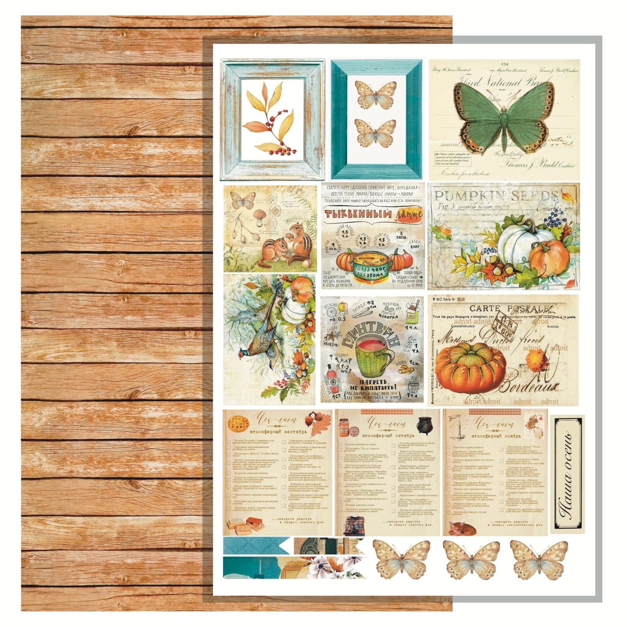 Набор двусторонней бумаги 20х27.5 см (чуть меньше А4), 8 листов (7листов двусторонних + односторонний лист с элементами для вырезания) + бонус элементы для вырезания на обороте обложки, плотность 250 г/м2.