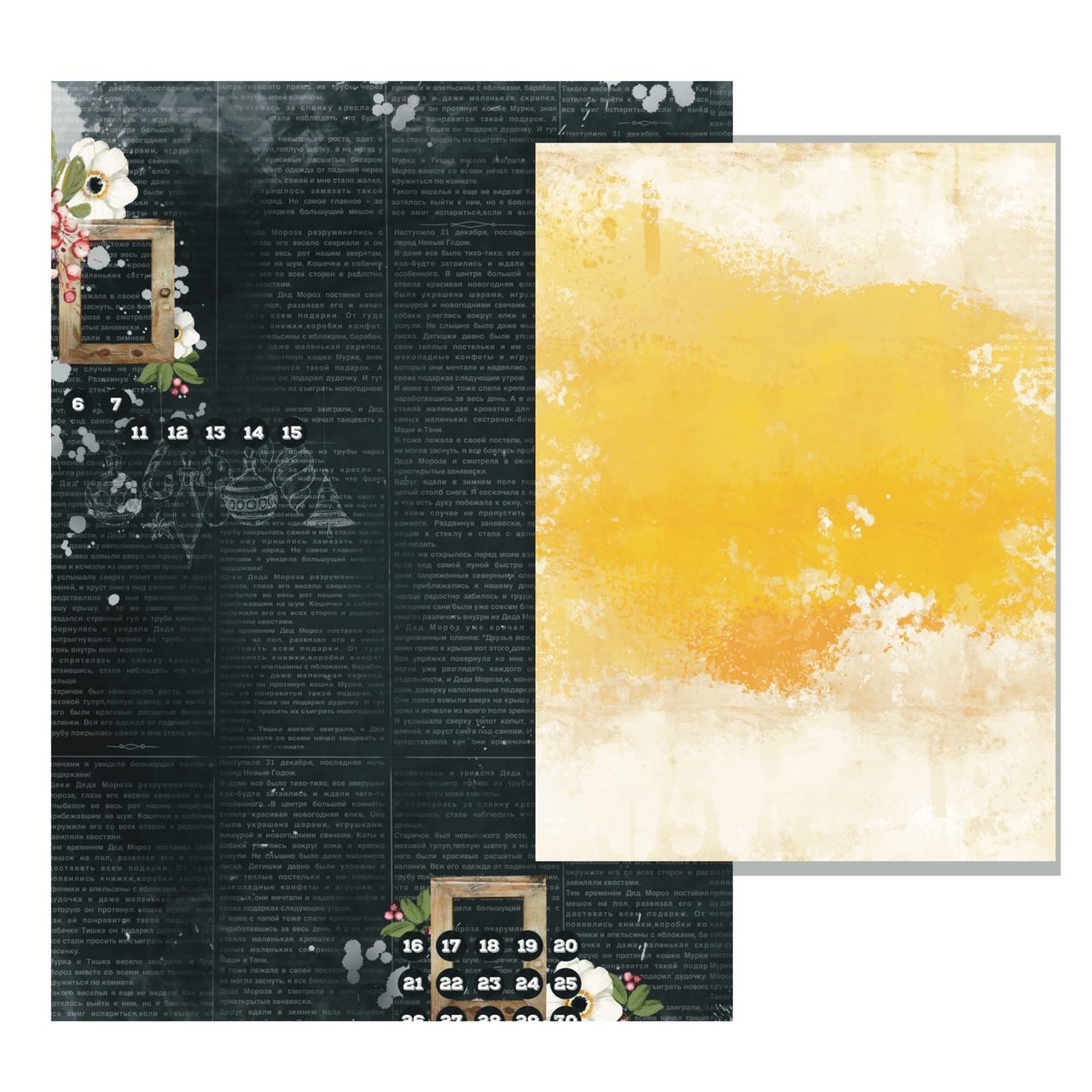 Набор двусторонней бумаги 20х27.5 см (чуть меньше А4), 8 листов (7листов двусторонних + односторонний лист с элементами для вырезания) + бонус элементы для вырезания на обороте обложки, плотность 250 г/м2.