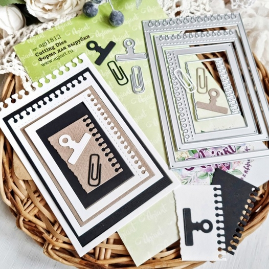 В наборе шесть ножей. Размеры вырубки: 143*95 mm., 112*80 mm., 90*63 mm., 56*38 mm., скрепка - 26*10 mm., таб - 28*22 mm.