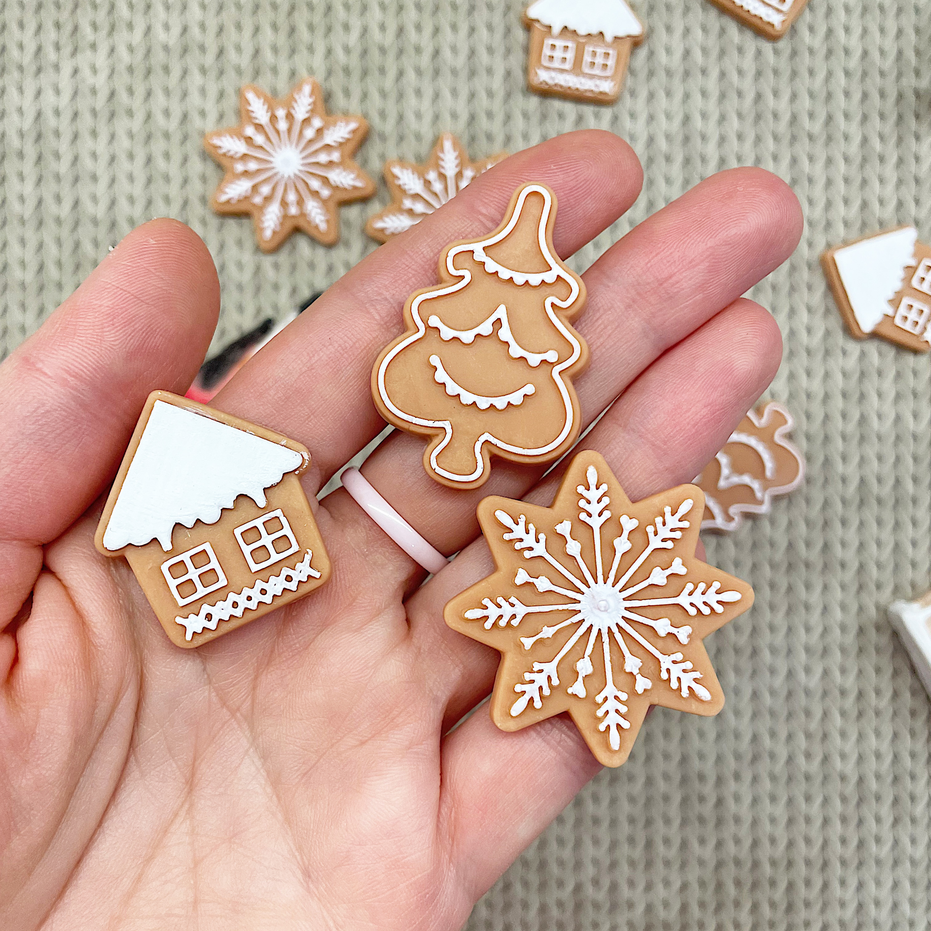 Размеры: снежинка 4 х 4 х 0,3 см, домик 3,2 х 3 х 0,3 см, ёлочка 4," х 2,8 х 0,3 см. Выполнены вручную из полимерной глины. Изделие ручной работы, возможны небольшие изменения во внешнем виде.