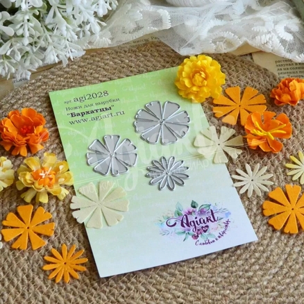 В наборе 3 ножа. Размеры вырубки: 35*35 mm., 32*32 mm., 27*27 mm. Ножи предназначены для бумаги и фоамирана. При работе с аппретированной тканью, возможно неполное прорезание в центре цветка из-за строения ножа.