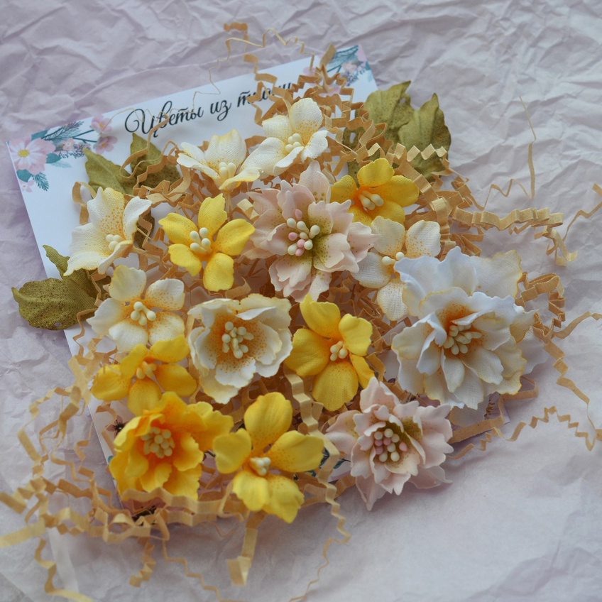 В наборе 24 элемента: 16 цветов и 6 листочков из ткани разного размера и цвета. Затонировано вручную. Может быть небольшая корректировка по цвету от набора к набору. Ручная работа.