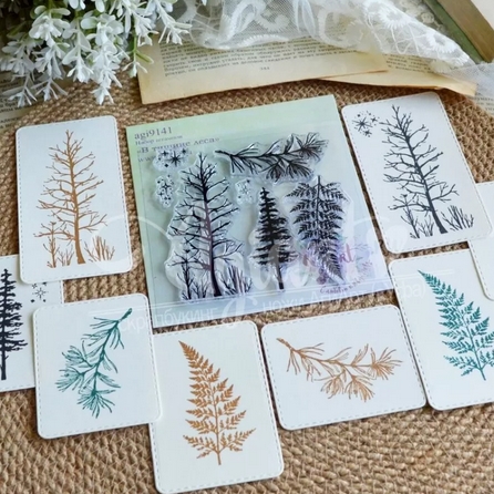 В комплекте 7 штампов. Размеры от 13*8 mm. до 93*40 mm. Размер папоротника: 66*32 mm. Размер сосновой ветки: 60*31 mm. Размер ели: 62*25 mm.