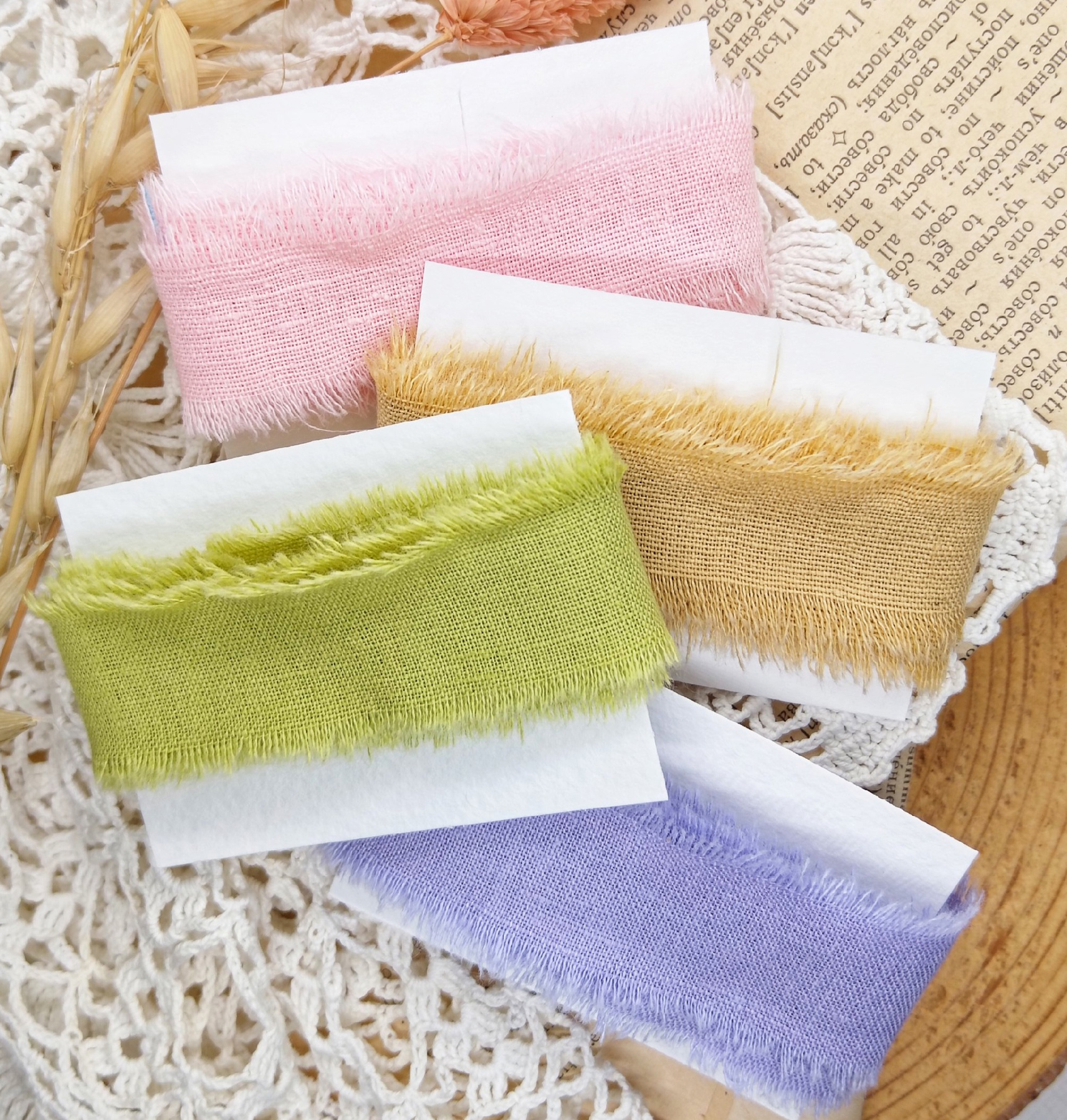 4 ленты, ширина 2,5 см, длина 1 м 30 см. Состав : 50% лен, 50% хлопок. Цвет: нежно - розовый, соломенный жёлтый, салатовый, сиреневый