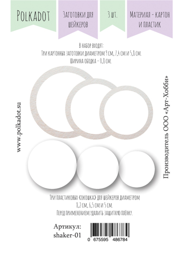 В набор входят: 1. Три картонные заготовки диаметром 9см, 7,4см, 5,8см с шириной ободка 0,8см.; 2. Три пластиковых "окошка" для шейкеров диаметром 8,2см, 6,5см, 5см. Перед применением удалисть с "окошка" защитную плёнку с двух сторон.