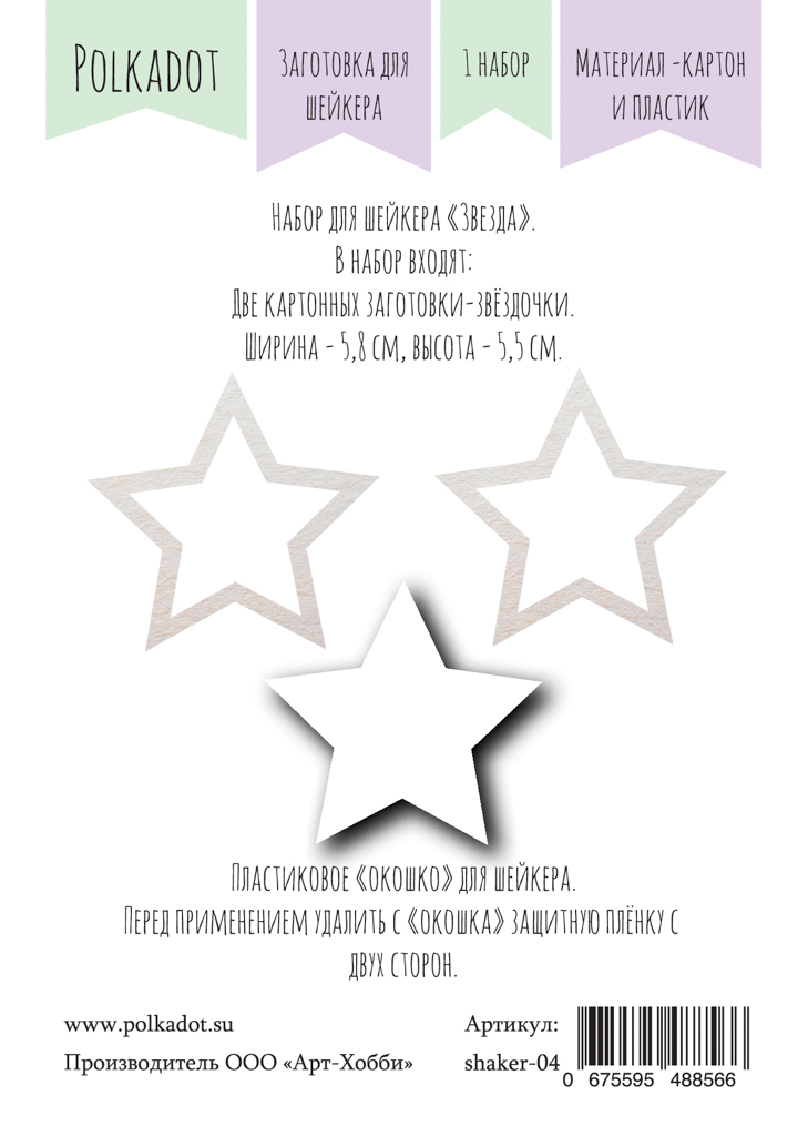 В набор входят: 1. две картонные заготовки - звёздочки (ширина 5,8см, высота 5,5см ); 2. Пластиковое "окошко" для шейкера. Перед применением удалисть с "окошка" защитную плёнку с двух сторон.