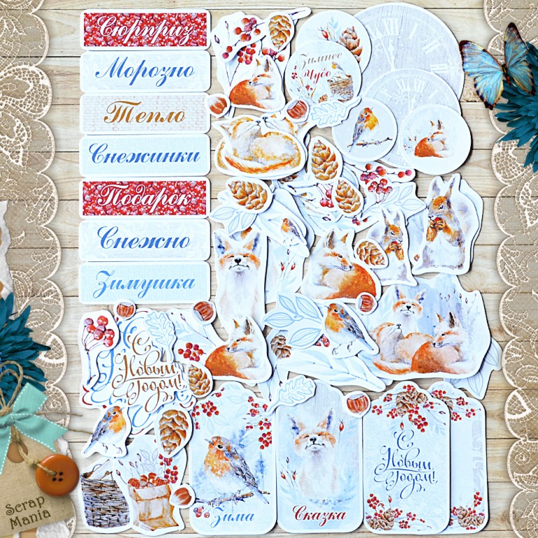 В наборе 71 высечка. Размер от 1,1х1,1 см до 7,8 см. Плотность 300 гр/м2.