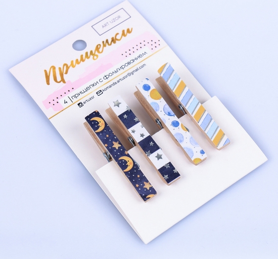 4 деревянные прищепки. Рисунок с фольгированием. Размер упаковки 11 × 7 см