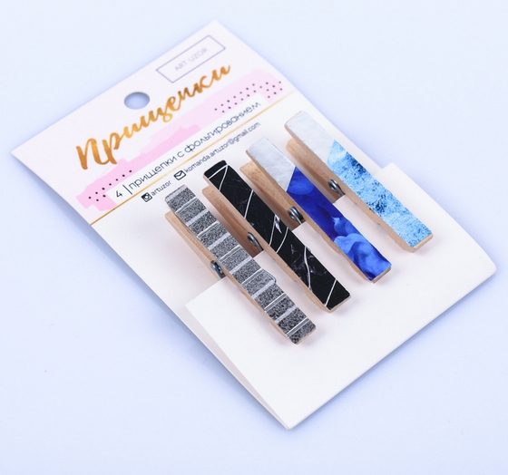 4 деревянные прищепки. Рисунок с фольгированием. Размер упаковки 11 × 7 см