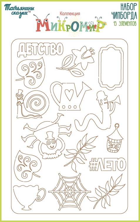 Размер листа с вырубкой около 14х21см. В наборе 15 элементов. Размер надписи "детство" около 5.5х1,5см. Размер паутинки около 5см. Чипборд выполнен из плотного картона 1,55мм. Предназначен для украшения и декорирования альбомомв и открыток в скрапбукинге. Можно использовать как не обработанным, так и окрашивать в любые цвета с помощью красок, спреев, паст и пр.