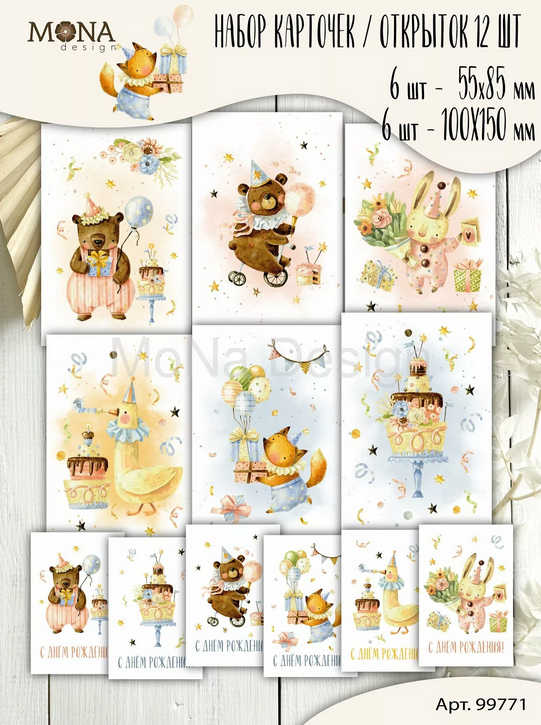 В наборе 12 открыток. 6 шт- 55*85 мм и 6 шт - 100*150мм. Плотность 300 гр/м2.