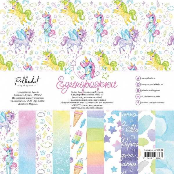 Набор бумаги 20 х 20 см Polkadot. "Единорожки"