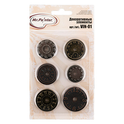 Набор декоративных элементов из металла в виде циферблатов. В наборе 6 шт. Диаметр элементов от 2,5 до 3,5 см.