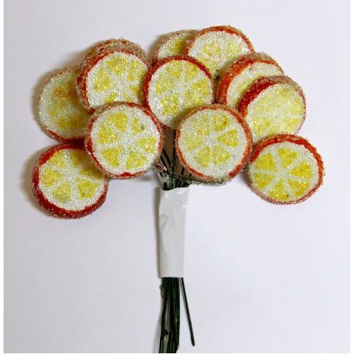 Декоративный букетик "Апельсиновые дольки в сахаре". 12 долек апельсина на ножке в "сахарной" обсыпке. Диаметр около 2 см. Можно использовать как с ножкой, так и без неё. Ножка гнётся.