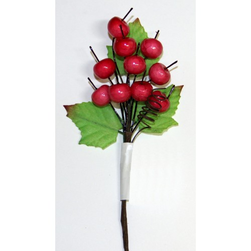 Декоративный букетик "Веточка красных ягод".10 ягод диаметром около 1 см, завитушка и 3 листочка Цвет красно-розовый. Ягоды глазурированы и имеют малюсенькую веточку.