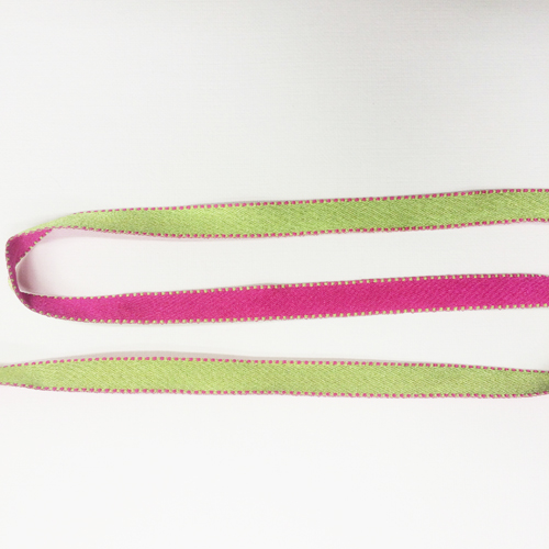 Лента атласная двусторонняя салатовая/фуксия с прострочкой, 10мм