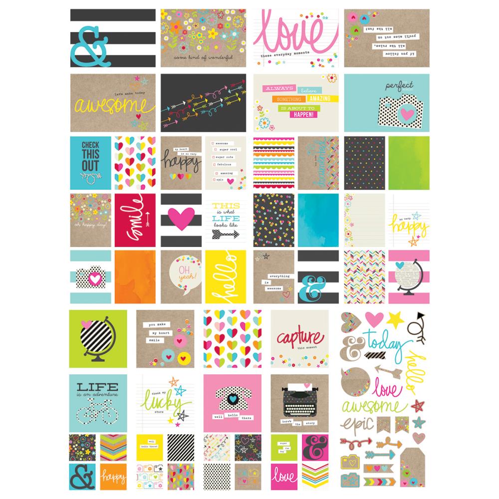 87 элементов:16 карточек 10 х 15 см, 32 карточки 7,5 х 10 см, 8 карточек 10 х 10 см ,32 карточки 5 х 5 см, 26 фигурных вырубных элементов